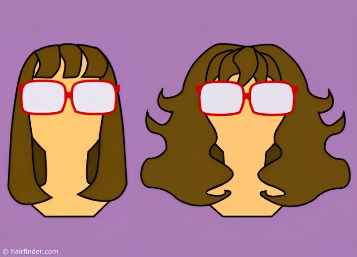Anche se non sei una donna minuta, se scegli questo tipo di occhiali devi seguire le stesse regole ed evitare una pettinatura che crei una cornice al viso. Un taglio più lungo di quello proposto sopra va comunque molto bene, basta che il volume che darai alla tua capigliatura sia adeguato all'ampiezza del viso.