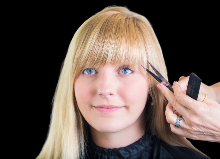 • Assicurarsi che la frangia penda sempre verso il basso. Se i capelli vengono tagliati troppo corti e la frangia spunta in avanti essa non è più utile a coprire la fronte o ad addolcire il viso. Bisogna poi fare particolare attenzione in caso di capelli grossi e crespi o ricci, in quanto i capelli grossi richiedono più peso per pendere verso il basso e i capelli ricci tendono a sollevarsi quando vengono tagliati. Per questo è importante tagliare sempre la frangia di una lunghezza maggiore di quella desiderata qualora sussistano dei dubbi. Sarà infatti sempre possibile spuntare le ciocche in seguito, mentre far ricrescere i capelli richiede molto più tempo.